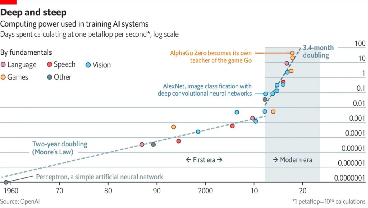 At its bare bones, AI = compute. Artificial intelligence works by running large sets of data through sophisticated computer algorithms to teach computers how to classify and understand this data. The bigger the data set and the more sophisticated the algorithms, the better the output. We see that computing costs scale exponentially with better AI:
